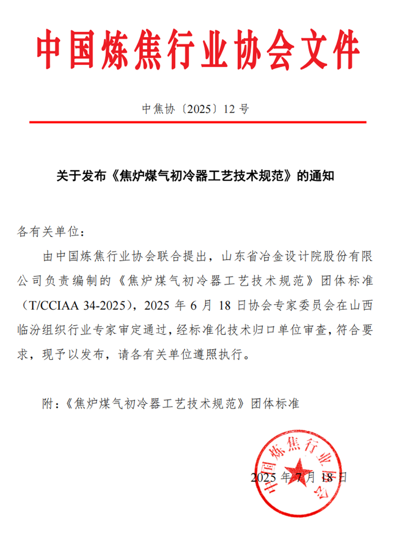 7月18日,由山冶設計主編的《焦爐煤氣初冷器工藝技術規范》T/CCIAA 34-2025(簡稱《規范》)正式發布并實施。《規范》對焦化煤氣凈化初冷器的工藝流程、操作參數以及質量指標作出了詳細規定,同時統一了初冷器的設計與操作標準,保障了煤氣冷卻過程的高效性與安全性。《規范》的發布與實施,可指導焦化企業在生產過程中有效把控初冷器的日常操作,為后續煤氣凈化及深加工的穩定運行創造有利條件。這是繼2024年7月1日正式實施、山冶設計主編的《焦爐煤氣脫硫廢液干法制酸技術規范》YB/T6115 - 2023之后的又一個行業規范,充分體現了山冶設計在焦化行業的技術引領作用與品牌影響力。