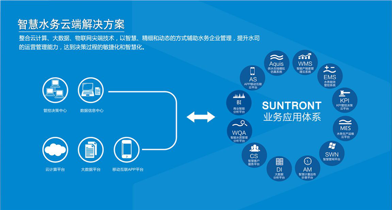 基于物聯網、云計算的管理平臺為各種水處理運營的安全管理、生產運行、水質化驗、設備管理、日常辦公等提供統一業務信息管理平臺,對企業實時生產數據、視頻監控數據、工藝設計、日常管理等相關數據進行集中管理、統計分析、數據挖掘,為不同層面的生產運行管理者提供即時、豐富的生產運行信息,為輔助分析決策奠定良好的基礎,為企業規范管理、節能降耗、減員增效和精細化管理提供強大的技術支持。